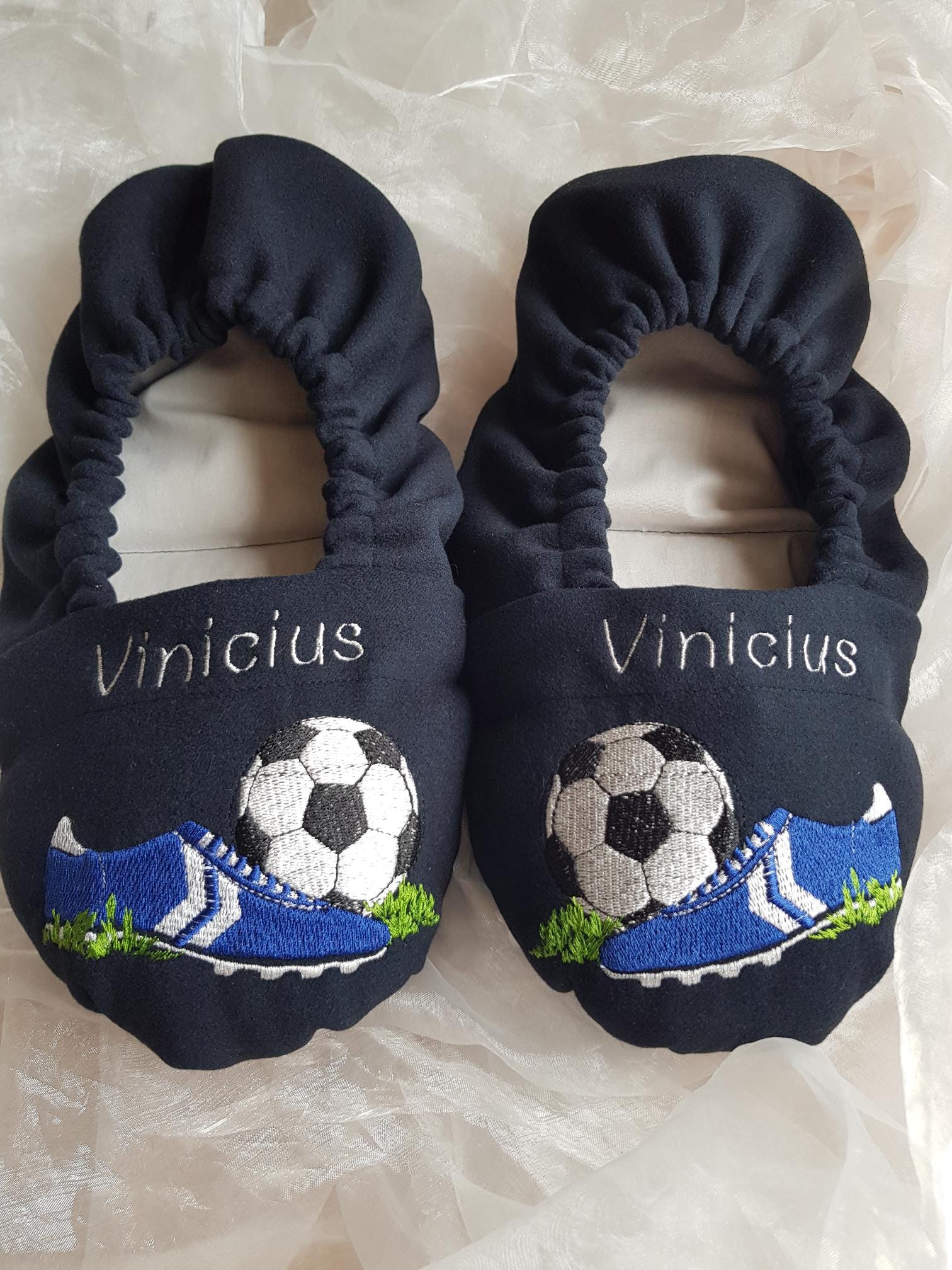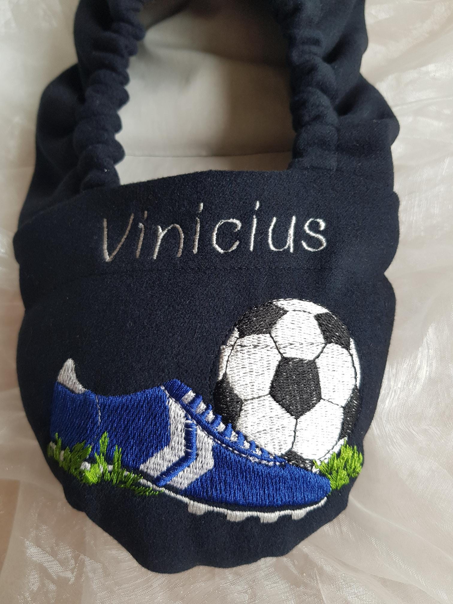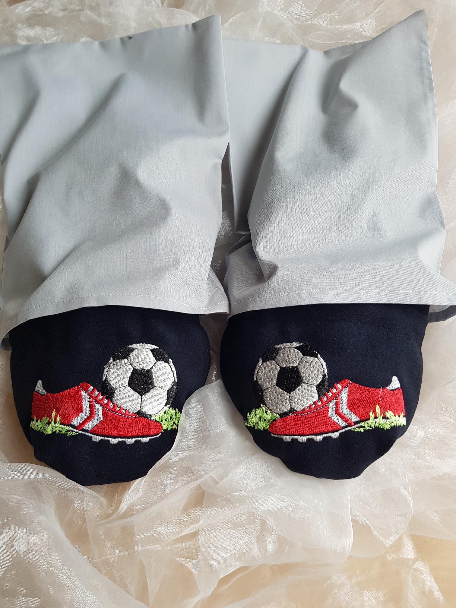 Bestickter Artikel, Fußball, Körnerschuhe, Weihnachten, Nikolaus, personalisierbar, Mikrowelle, Fußballpuschen, Dinkelschuhe, Gr. 32-48